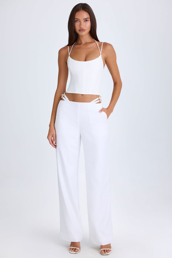 Beyaz Uzun Kemerli Kesikli Geniş Paça Pantolon